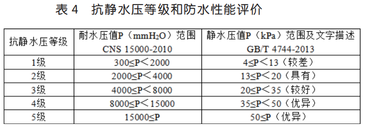 可見,防水透濕面料倒杯 - 蒸發(fā)法的透濕率基本符合正態(tài)分布,≤ 4000g/(m2·24h)的比例為10.0%,> 10000g/(m2·24h)的比例 10.0%,一半以上測(cè)試結(jié)果集中在 5000~ 9000 g/(m2·24h)。而靜水壓測(cè)試結(jié)果相對(duì)比較分散,≤ 30kPa 的比例為 16.0%,> 170kPa 的比例為 12.0%,70% 以上的測(cè)試結(jié)果大于 70kPa。以 GB/T 32614-2016《戶外運(yùn)動(dòng)服裝 沖鋒衣》中對(duì)沖鋒衣面料 I 級(jí)功能性要求而言,即洗滌前透濕率≥ 5000g/(m2·24h),靜 水 壓 ≥ 50kPa,50 塊 面 料 透 濕 率 合 格 率 為84.0%,靜水壓合格率為 82.0%,合格率基本一致。但靜水壓指標(biāo)相對(duì)更好,三分之二的樣品靜水壓> 100kPa,遠(yuǎn)遠(yuǎn)滿足標(biāo)準(zhǔn)要求,這也驗(yàn)證了靜水壓指標(biāo)通過在織物表面的涂層處理很容易符合標(biāo)準(zhǔn)要求。將 GB/T 4744-2013《紡織品 防水性能的檢測(cè)和評(píng)價(jià) 靜水壓法》及臺(tái)灣標(biāo)準(zhǔn) CNS 15000-2010《防水透濕紡織品性能評(píng)估》[8] 對(duì)靜水壓的評(píng)價(jià)性能列如表 4 所示。