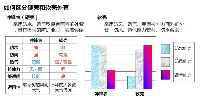 下面從一張圖區(qū)別硬殼軟殼沖鋒衣,簡(jiǎn)單來說硬殼更加戶外專業(yè),功能性更強(qiáng),適合戶外活動(dòng)穿;而軟殼是在原有保暖防風(fēng)面料上增添一個(gè)防水層,功能性差一些,但同樣具備防水性能,適合日常交際穿著。