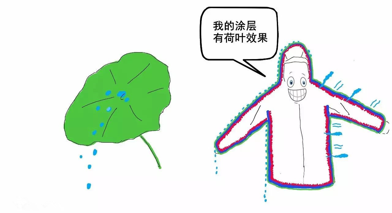 涂層可以實(shí)現(xiàn)“荷葉效果”,讓水珠滾落,同時(shí)水蒸氣能從面料縫隙排出。