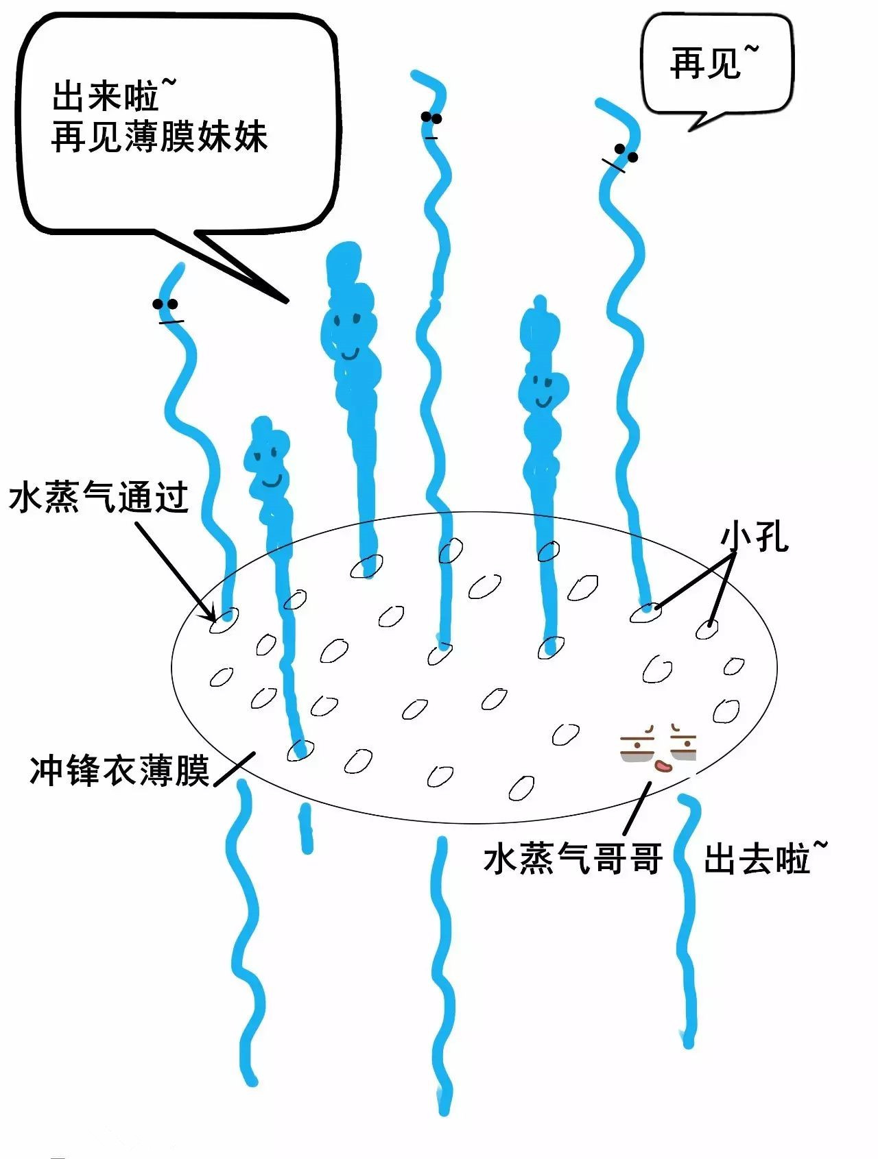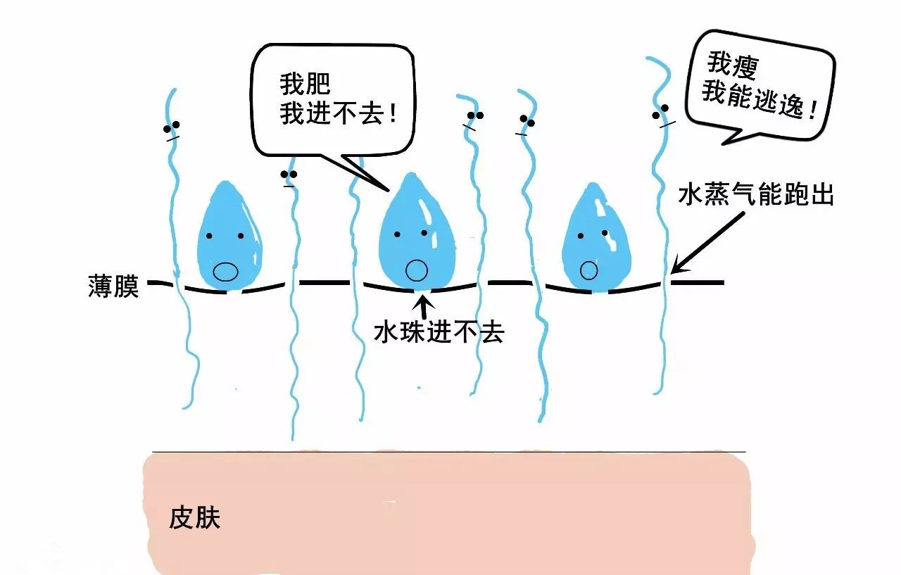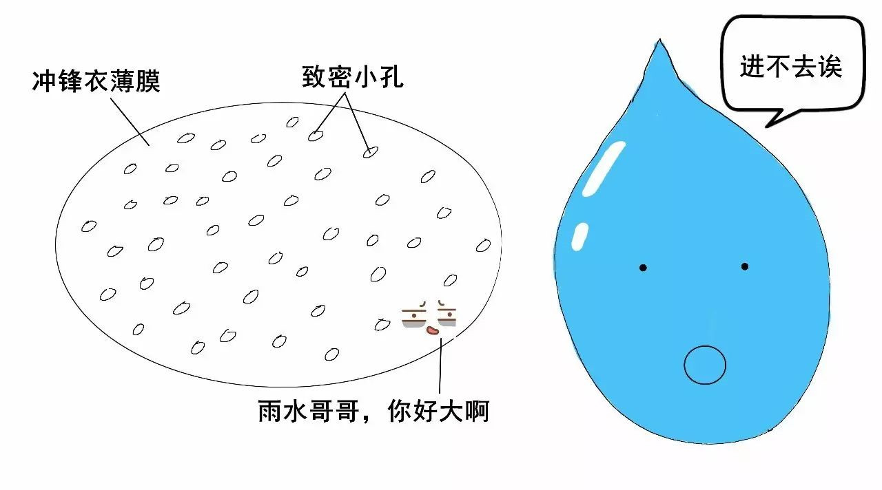 2)沖鋒衣的薄膜的孔很小,比雨滴小很多,所以雨滴進(jìn)不去小孔。