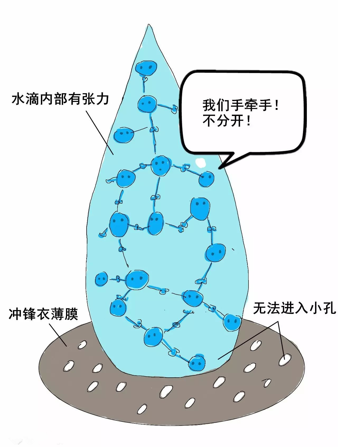 1)水滴內(nèi)部的張力讓它無法進(jìn)入薄膜。因?yàn)橛甑蔚摹皬埩Α焙軓?qiáng),水分子之間強(qiáng)烈吸引,就像抱團(tuán)在一起。當(dāng)雨滴接觸薄膜時(shí),沒有水分子愿意離開水滴。