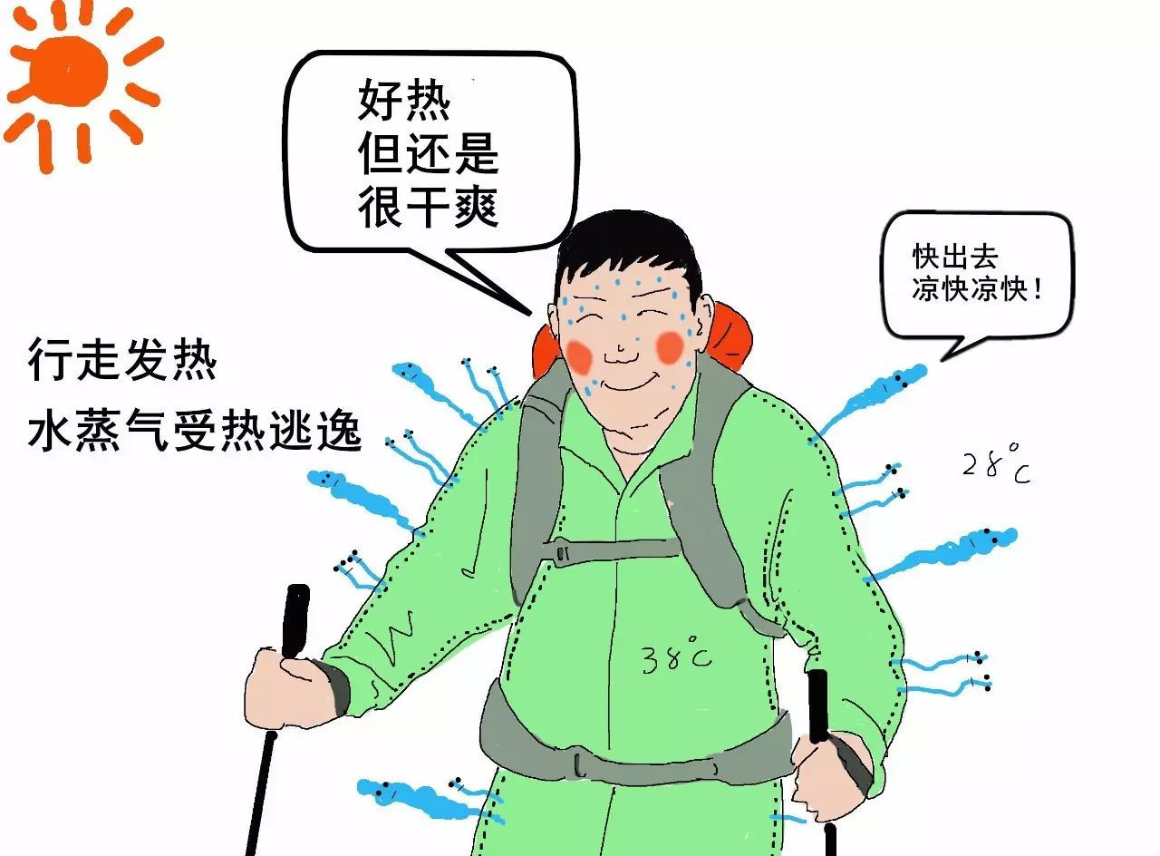 1)人體熱量促進(jìn)水蒸氣逃逸。登山時(shí),人體溫升高,內(nèi)部的溫度大于外界空氣,促使汗氣向沖鋒衣外擴(kuò)散。薄膜上的小孔就像工廠的煙囪,為水蒸氣提供了排放通道。