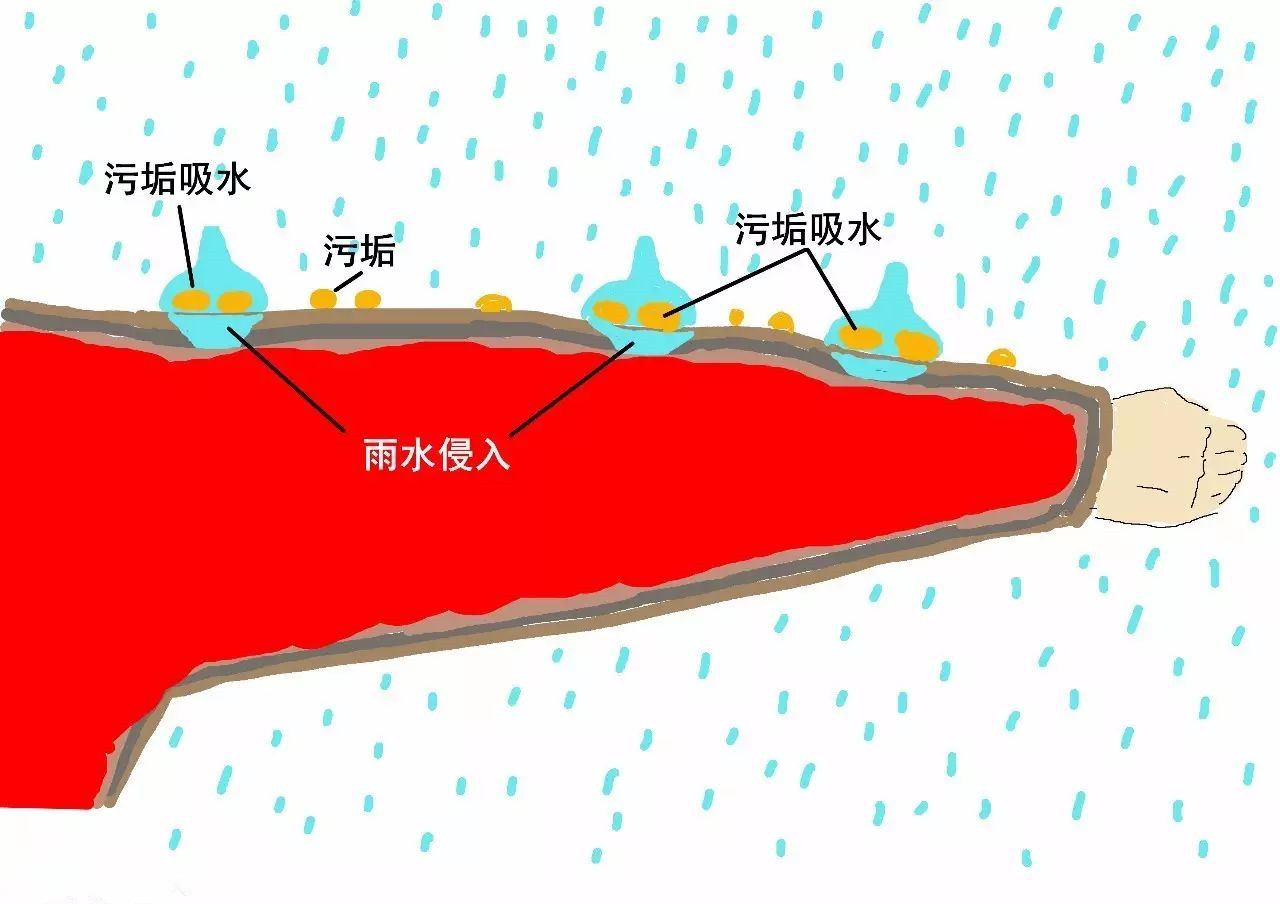 最初:涂層失效——污垢具有吸水的作用,衣服表面的污垢會給雨水可乘之機(jī)。