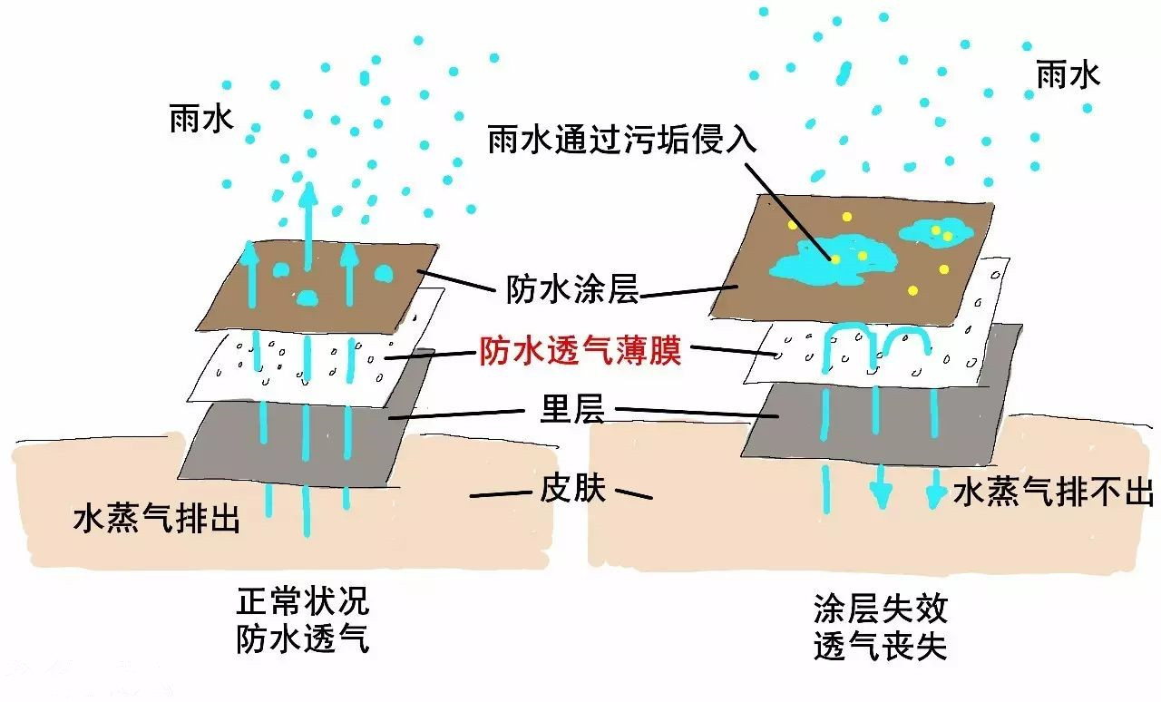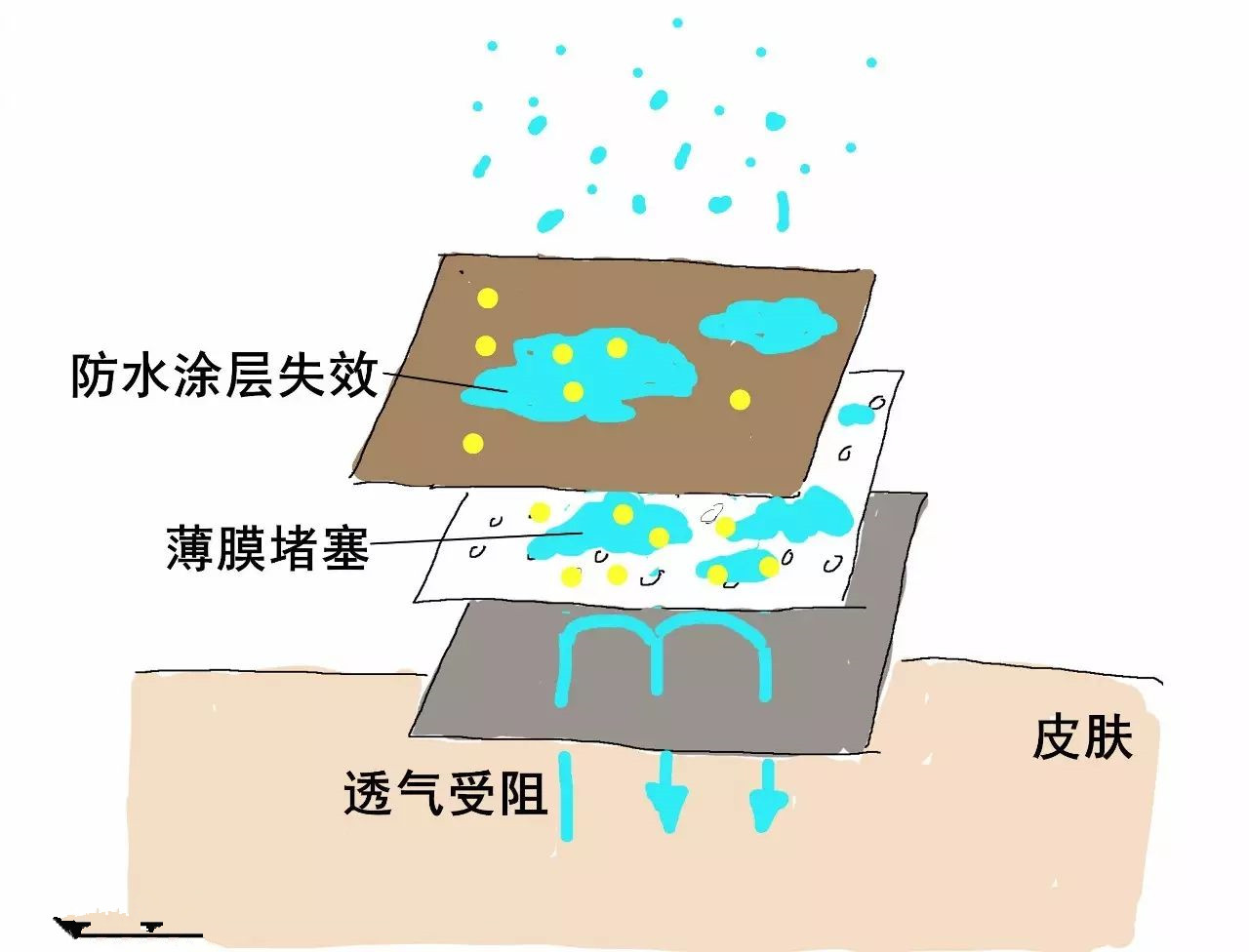 對有薄膜的沖鋒衣而言,如果污垢只是讓涂層失效,雨水并不會進(jìn)入身體,但涂層失效讓水蒸氣無法逃逸,透氣功能也就失效。