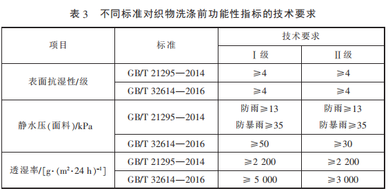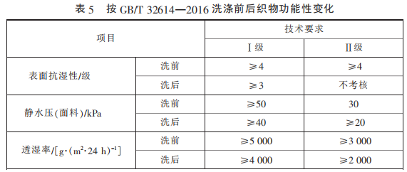 考慮到防水透濕面料功能的 耐用性,GB/T 32614—2016 中增加 了對(duì)功能性指標(biāo)的洗后測(cè)試,采用 標(biāo)準(zhǔn) GB/T 8629—2001《紡織品 試 驗(yàn)用家庭洗滌和干燥程序》 中 的 5A 程 序 洗 滌 3 次 并 懸 掛 晾 干,洗 后的指標(biāo)要求變化具體見(jiàn)表 5,相 較于洗前,指標(biāo)略有降低。