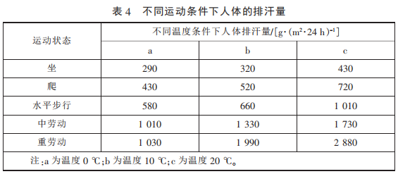 GB/T 32614—2016 中 功 能 性 指 標(biāo)(洗 前)與 GB/T 21295—2014 《服裝理化性能的技術(shù)要求》對(duì)比 可知,GB/T 32614—2016 中對(duì)于拒 水、耐靜水壓和透濕率 3 項(xiàng)功能性 要求更高,尤其是Ⅰ類產(chǎn)品的耐靜 水壓和透濕率遠(yuǎn)高于 GB/T 21295— 2014 的技術(shù)要求。兩標(biāo)準(zhǔn)對(duì)這 3 項(xiàng) 性能要求對(duì)比見(jiàn) 表 3。 滿 足 GB/T 32614—2016 的沖鋒衣可以抵擋暴 雨的沖擊,也滿足登山、攀巖等大 運(yùn)動(dòng)量下的透濕要求,不同條件下 人體的排汗量見(jiàn)表 4。
