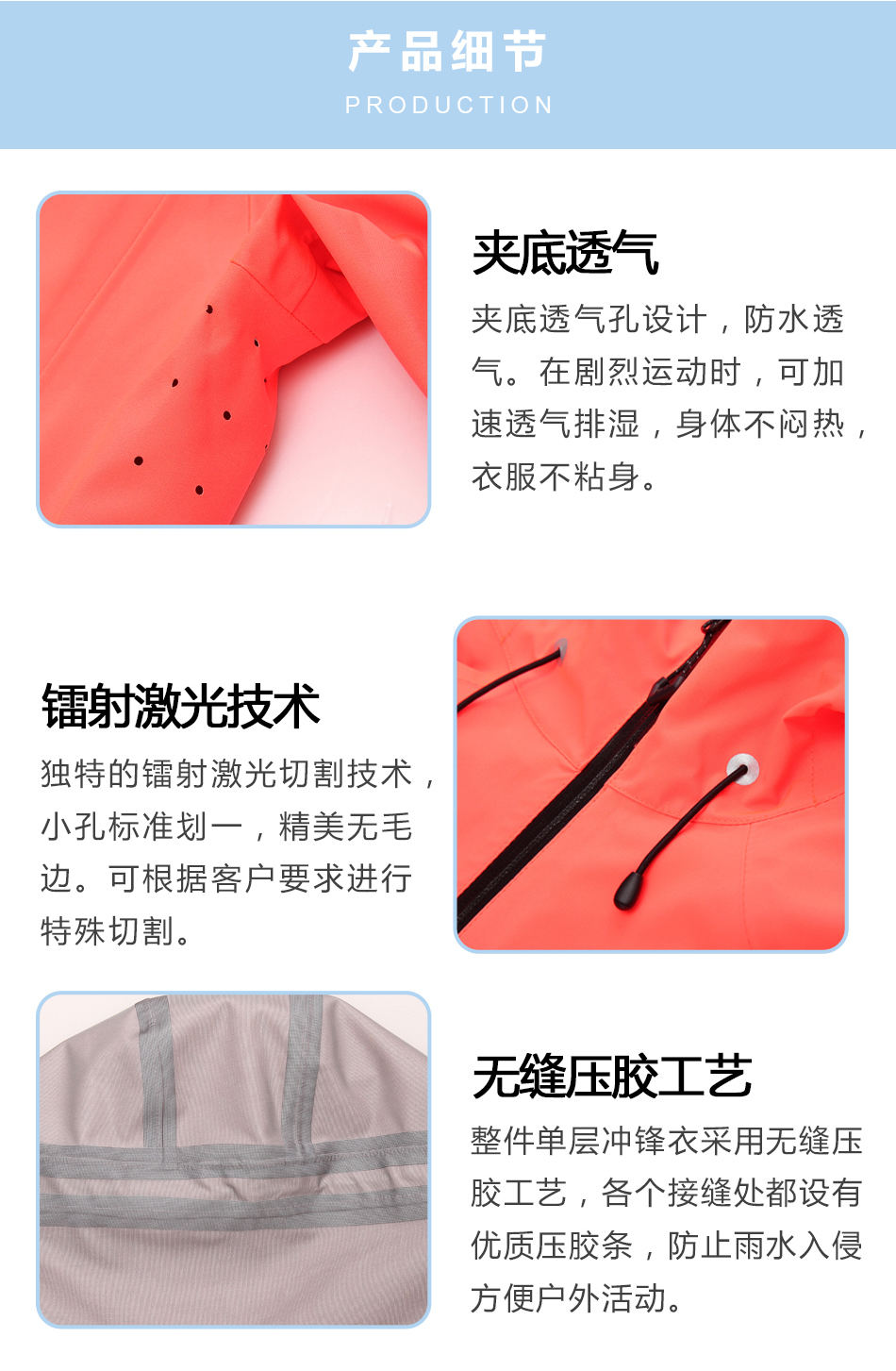 無縫壓膠工藝:整件單層壓膠沖鋒衣采用無縫壓膠工藝,各個(gè)接縫處都設(shè)有優(yōu)質(zhì)壓膠條,防止雨水入侵方便戶外活動。
