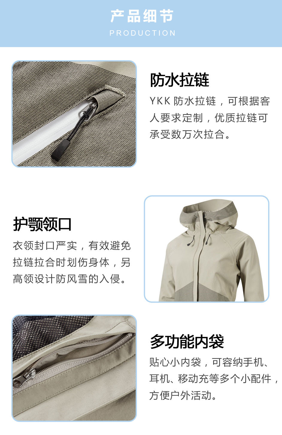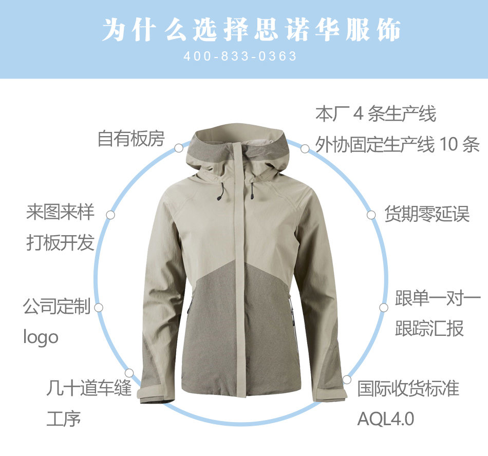 防水拉鏈:YKK防水拉鏈,可根據(jù)客人要求定制,優(yōu)質(zhì)拉鏈可承受數(shù)萬次拉合。
