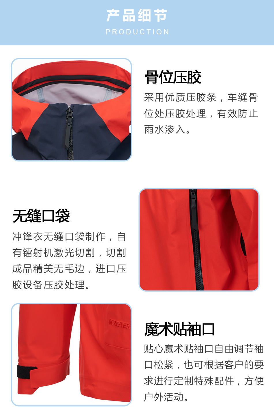 無縫口袋:單層沖鋒衣代工無縫口袋制作,自有鐳射機(jī)激光切割,切割成品精美無毛邊,進(jìn)口壓膠設(shè)備壓膠處理。