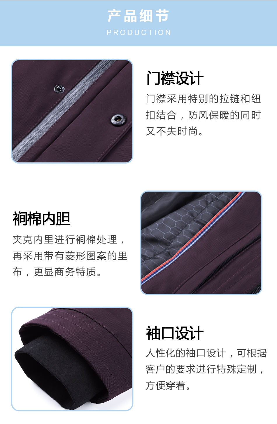 門襟設(shè)計(jì):門襟采用特別的拉鏈和紐扣結(jié)合,防風(fēng)保暖的同時(shí)又不失時(shí)尚。