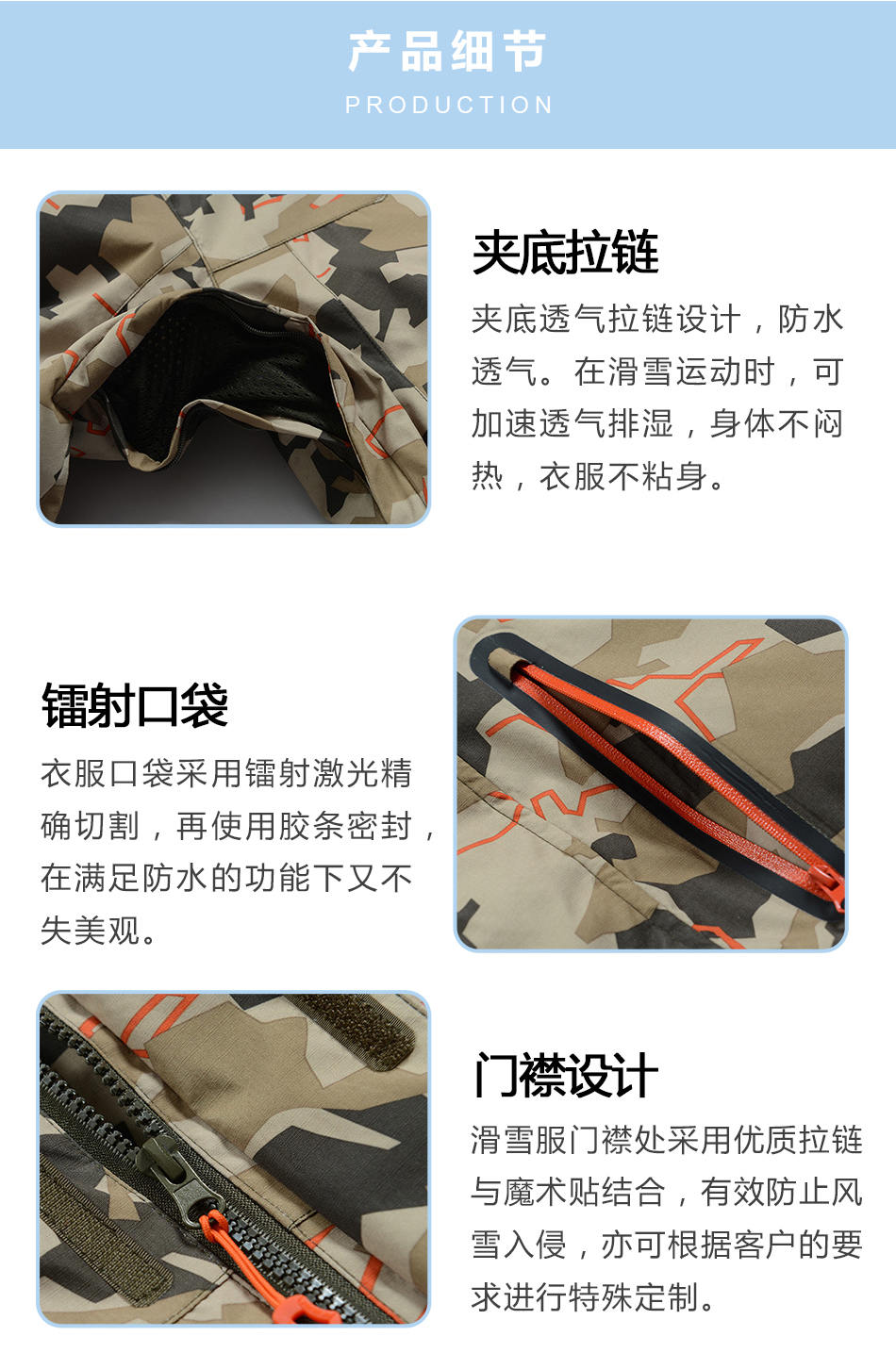 門襟設(shè)計(jì):滑雪服門襟處采用優(yōu)質(zhì)拉鏈與魔術(shù)貼結(jié)合,有效防止風(fēng)雪入侵,亦可根據(jù)客戶的要求進(jìn)行特殊保暖滑雪服加工。